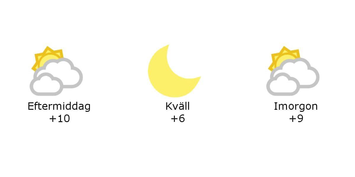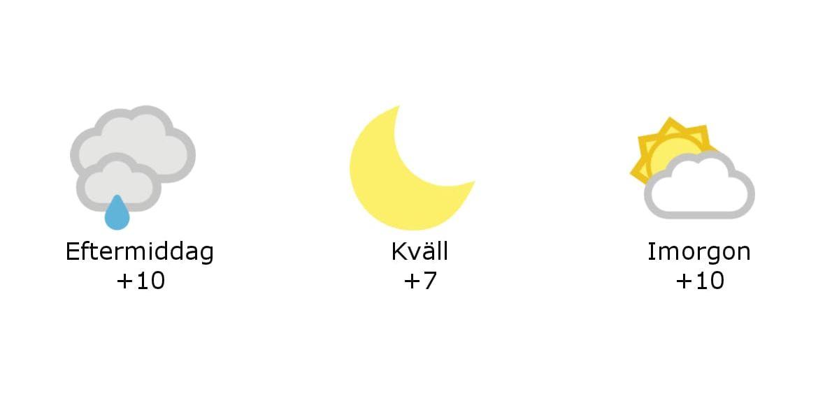 Mellerud: 10 grader och mulet och lätt regn under eftermiddagenEftermiddagen ger molnigt till mulet väder med lätt regn och temperaturer på 8-11 grader.
