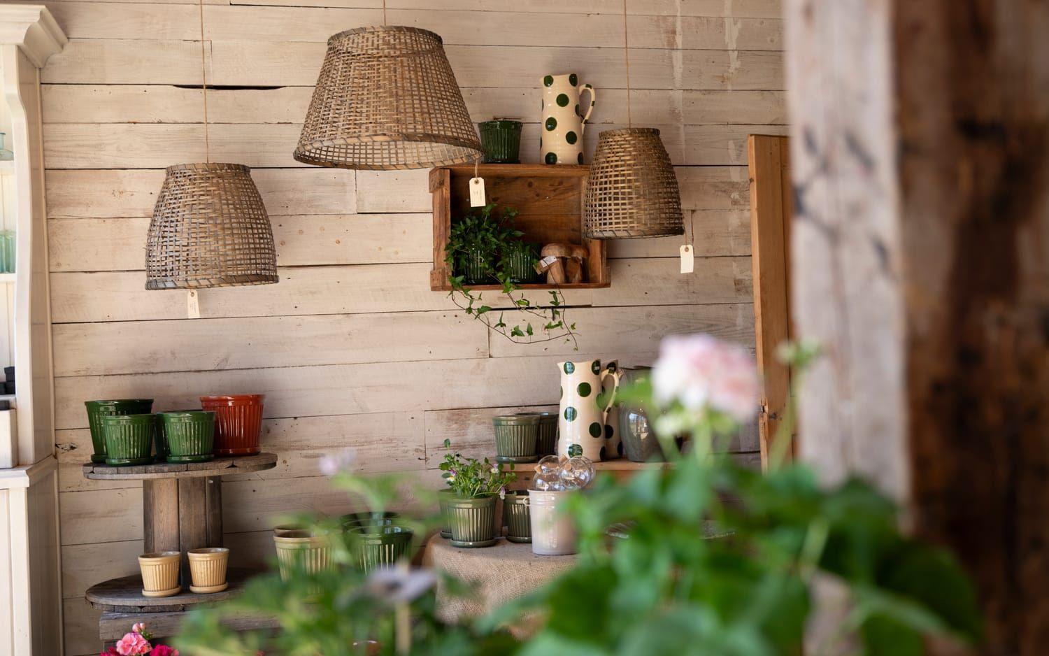 I butiken står keramikföremål uppställda i ett träskåp. En vas fylld med färgsprakande tulpaner och körsbärsblom vittnar om att våren verkligen är här.