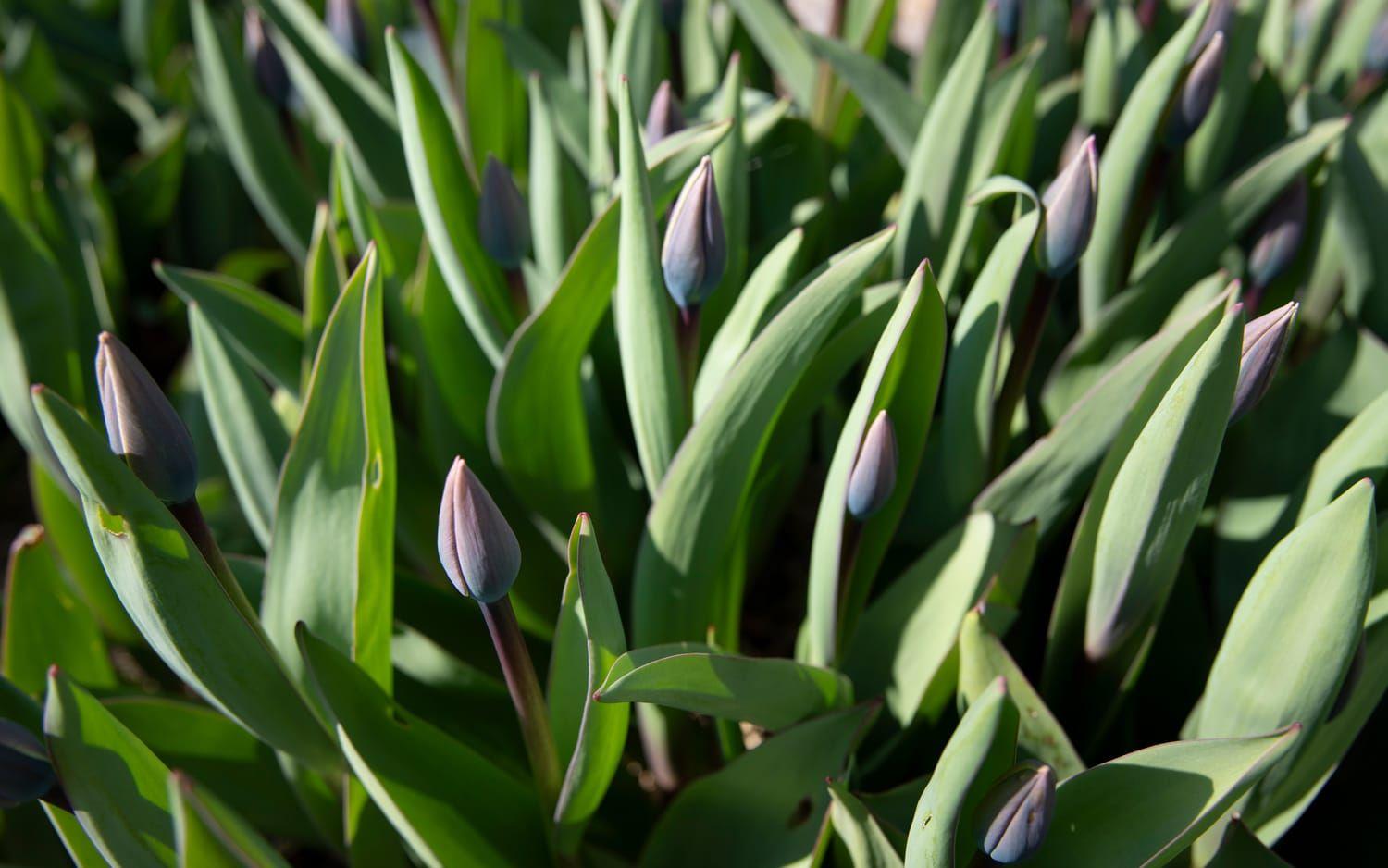 Denna vår har de därför valt att växla upp. I det inhägnade blomsterlandet sprider grönskan ut sig i pallkragarna. Men vid första anblick är det svårt att tro att 6 000 tulpaner samsas i jorden.